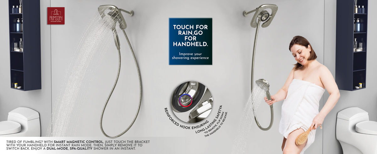 • Patented Magnetic Docking System: Switch effortlessly between handheld and rainfall modes by simply touching the overhead bracket. The patented magnetic control ensures a secure, reliable dock every time. Enjoy the luxury of a 2-in-1 shower system without the hassle of traditional dual showerheads. cUPC certified for safety and durability.