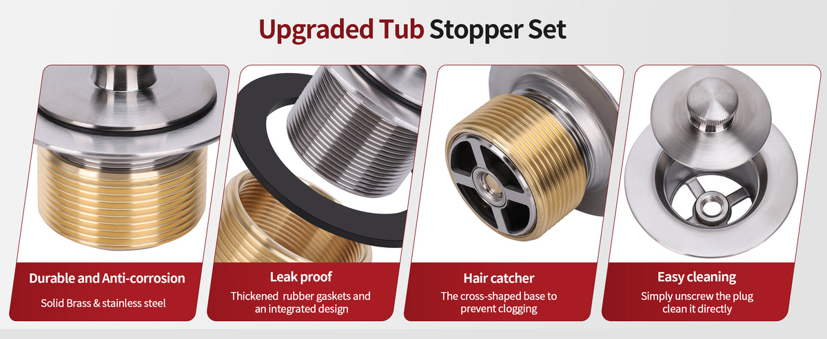 • 【Durable】: Expertly crafted from robust brass and stainless steel, our tub drain kits offer high strength and durability for long-term use in wet environments. Thickened rubber gaskets minimize the risk of leaks.Unscrew the plug for straightforward cleaning.