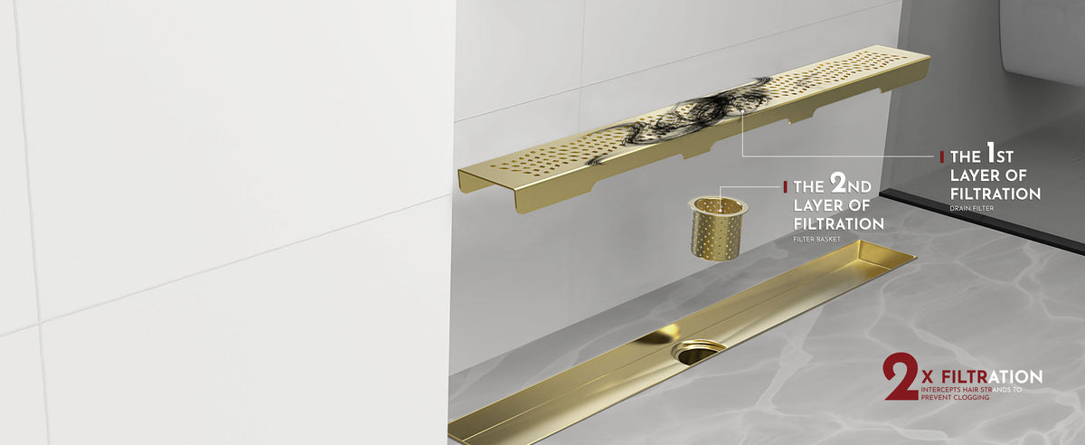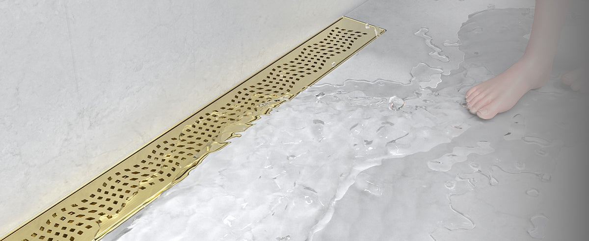 The WEBANG 36-Inch Wave-Hole Pattern Linear Shower Drain – Brushed Gold integrates seamlessly with standard US NO HUB Drain Base Systems. Featuring a 2" central outlet, it delivers powerful drainage at 5.28–6.6 gallons per minute. The precision-engineered wave-hole grate design effectively filters out hair and debris, ensuring clog-free performance and a consistently dry, clean shower space.