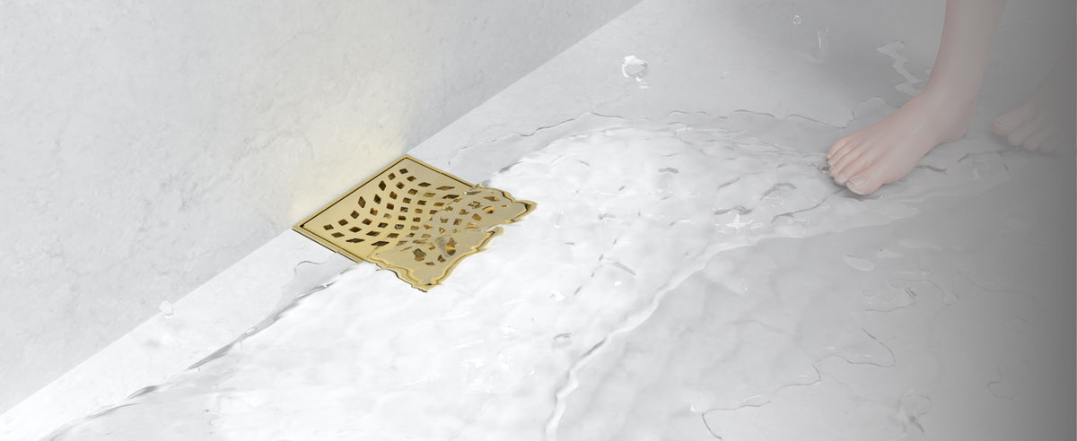 The WEBANG 4-Inch Wave-Hole Pattern Square Shower Drain with Flange – Brushed Gold integrates seamlessly with standard US NO HUB Drain Base Systems. Featuring a 2" central outlet, it delivers powerful drainage at 5.28–6.6 gallons per minute. The precision-engineered Wave-Hole grate design effectively filters out hair and debris, ensuring clog-free performance and a consistently dry, clean shower space.