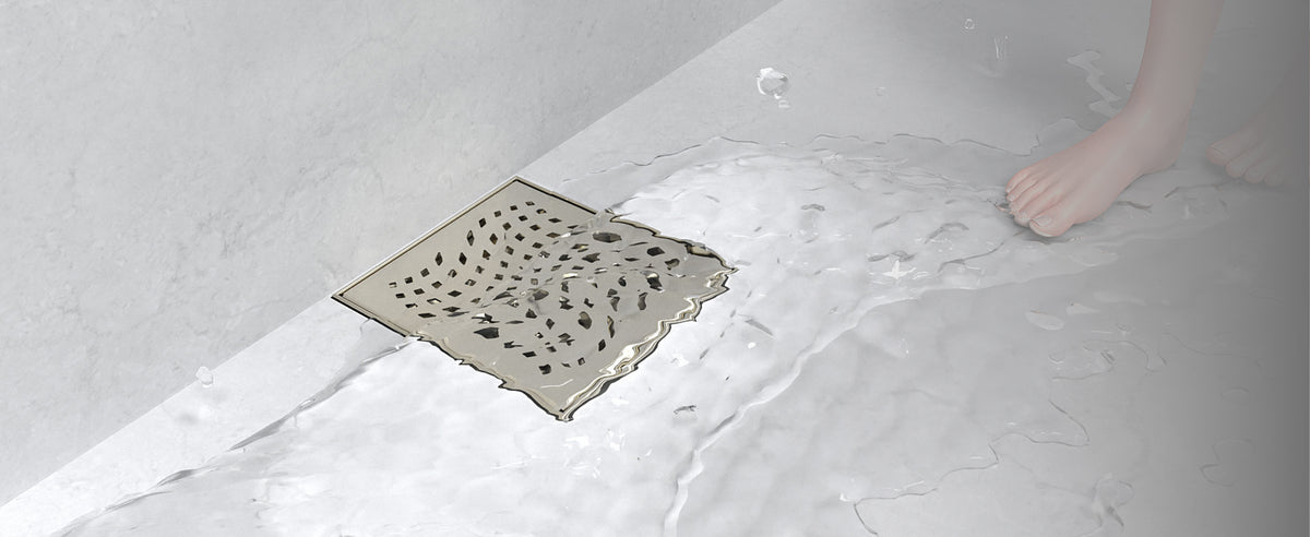 The WEBANG 6-Inch Wave-Hole Pattern Square Shower Drain with Flange – Brushed Nickel integrates seamlessly with standard US NO HUB Drain Base Systems. Featuring a 2" central outlet, it delivers powerful drainage at 5.28–6.6 gallons per minute. The precision-engineered Wave-Hole grate design effectively filters out hair and debris, ensuring clog-free performance and a consistently dry, clean shower space.
